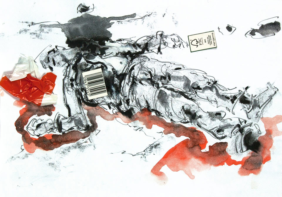 Material: Aquarellfarbe, Bleistift, Konsumartefakte