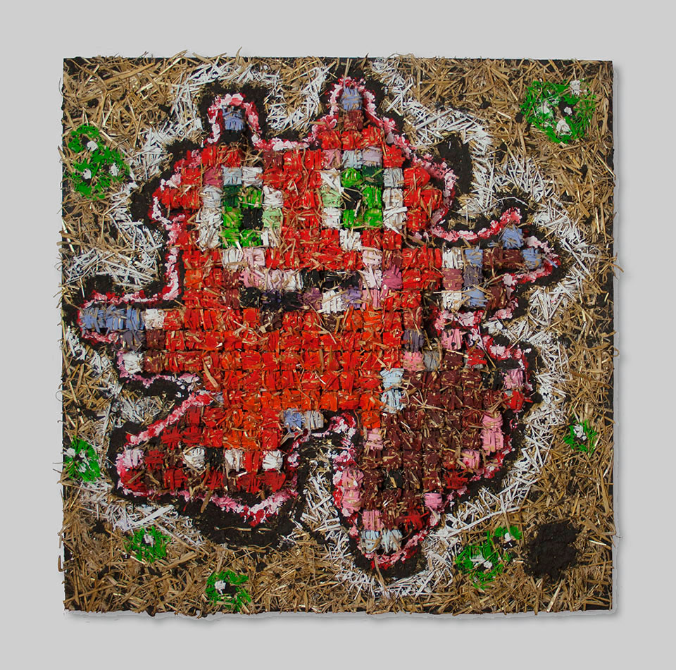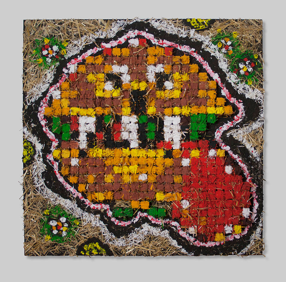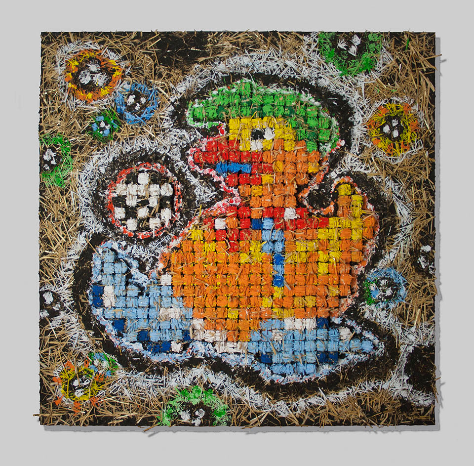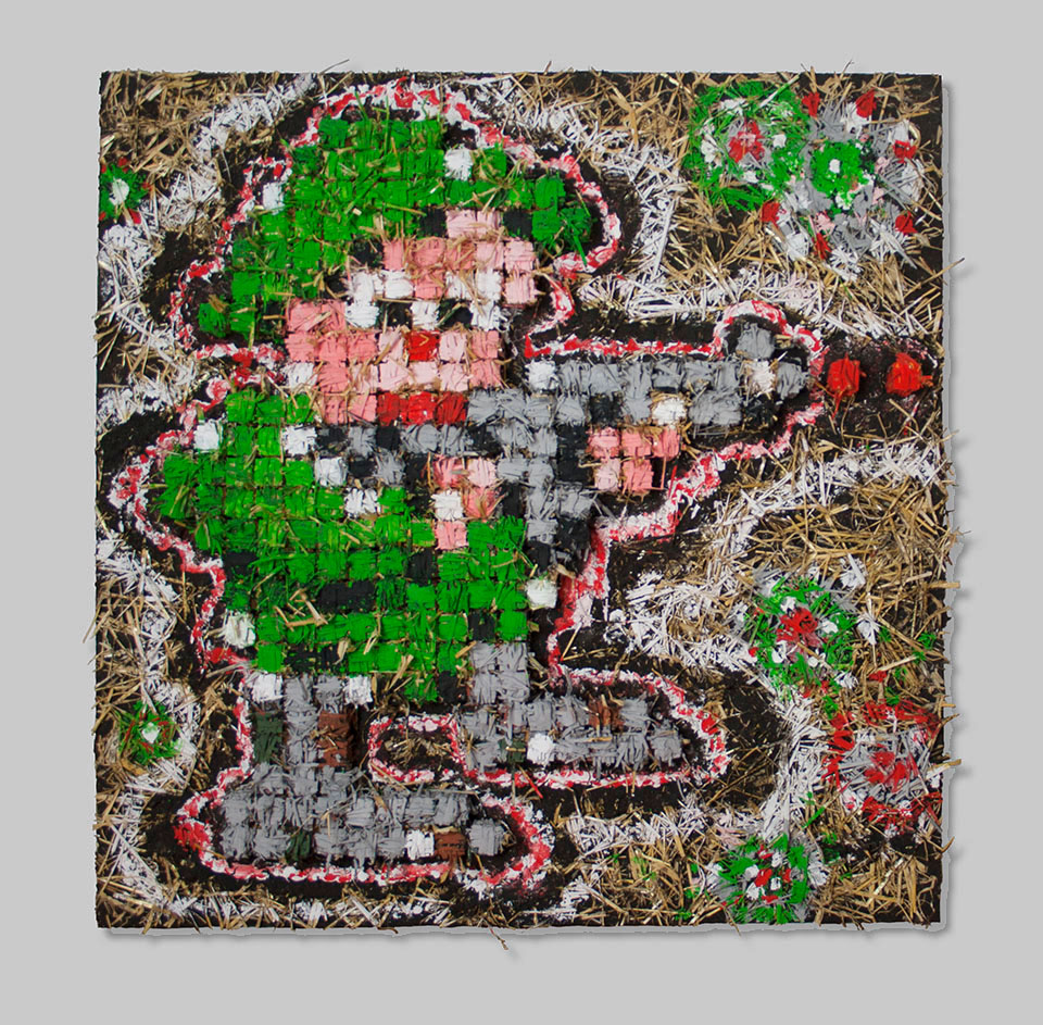 Sie zeigt „gepixelte“ Motive, entlehnt aus dem Bereich „Computergames“, bestehend aus